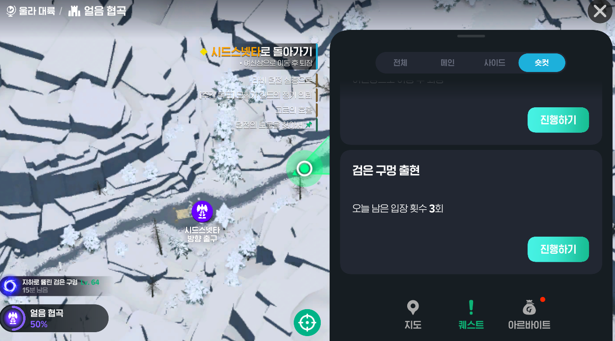 사냥터 안에서 퀘스트 창에 들어가서 숏컷을 보시면 검은 구멍 입장 가능한 횟수가 나옵니다.