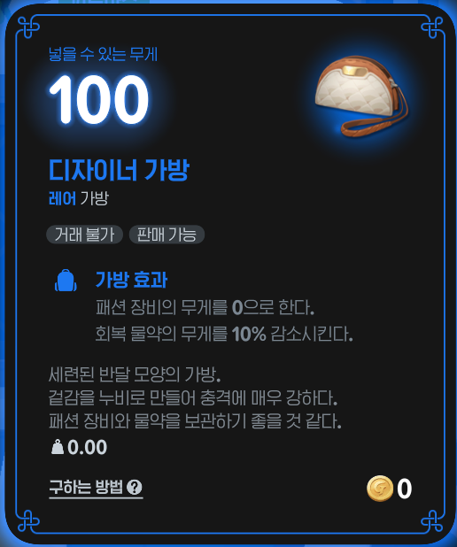 - 디자이너 가방 : 패션 장비 무게 0 처리, 회복 물약 무게 10% 감소