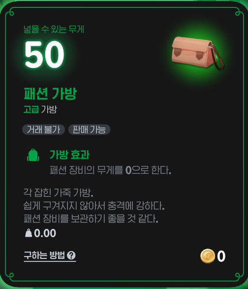 - 패션 가방 : 패션 장비 무게 0 처리