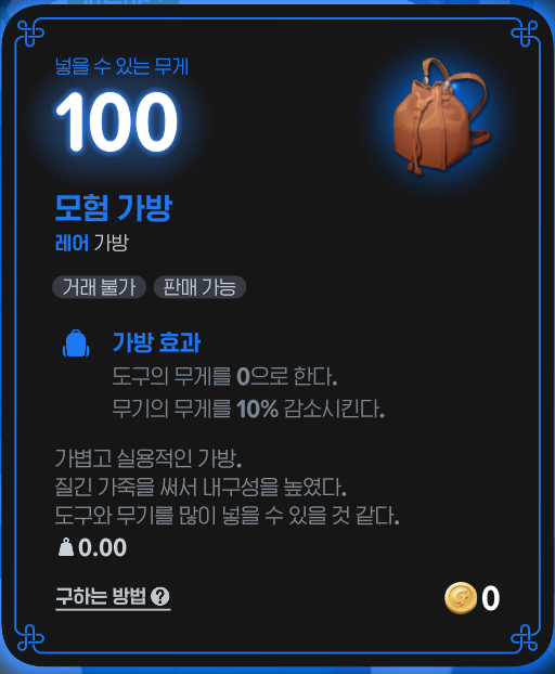- 모험 가방 : 도구 무게 0 처리, 무기 무게 10% 감소
