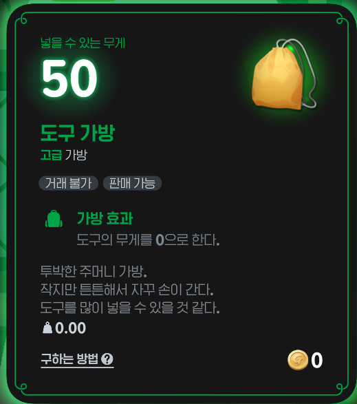 - 도구 가방 : 도구 무게 0 처리