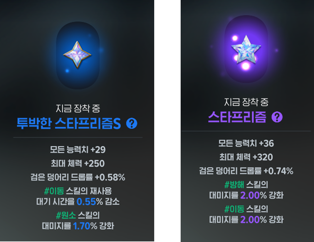 스타프리즘 같은 상위 보석에는 스킬 태그가 붙고, 해당 속성을 강화해주는데요.
