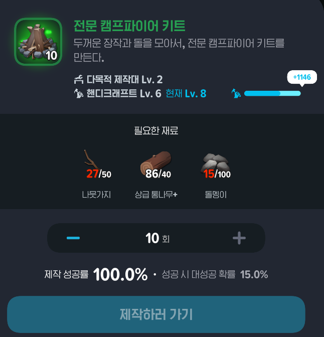 돌멩이는 "제작 > 아이템 > 캠프파이어"에서 전문 캠프파이어 키트 10개를 만들려고 하면 100개가 필요하다고 하는데