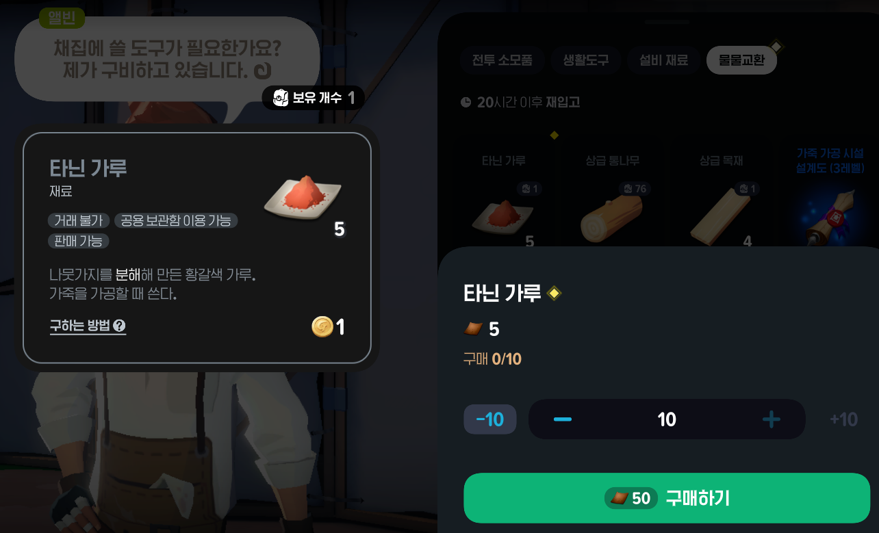 엘빈과 물물교환으로 타닌가루 얻기