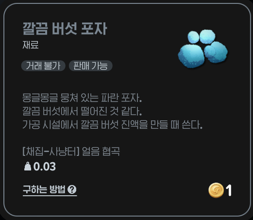 포자 10개 채집을 돌려놓으면, 깔끔 버섯이 매우 많이 채집되어 있을거에요.