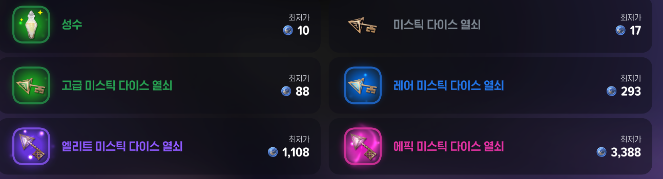 25년 5월 기준으로, 엘리트 열쇠는 1천 데카, 에픽 다이스는 3천 데카에 판매되고 있습니다.