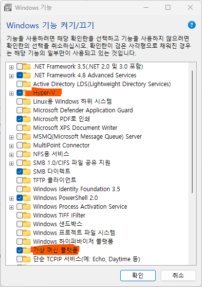 "Windows 기능 켜기/끄기" 메뉴를 검색해서, 아래와 같이 Hyper-V와 가상 머신 플랫폼을 체크하고 저장합니다.