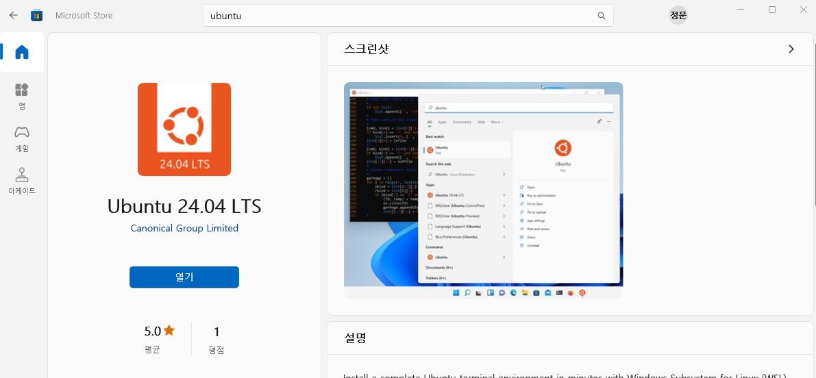설치가 완료되면 시작 메뉴에 Ubuntu를 검색하시면 설치된 것을 확인하실 수 있습니다.