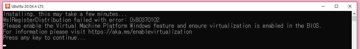만약 WslRegisterDistrubtion failed with error: 0x80370102 같은 에러가 나오고,