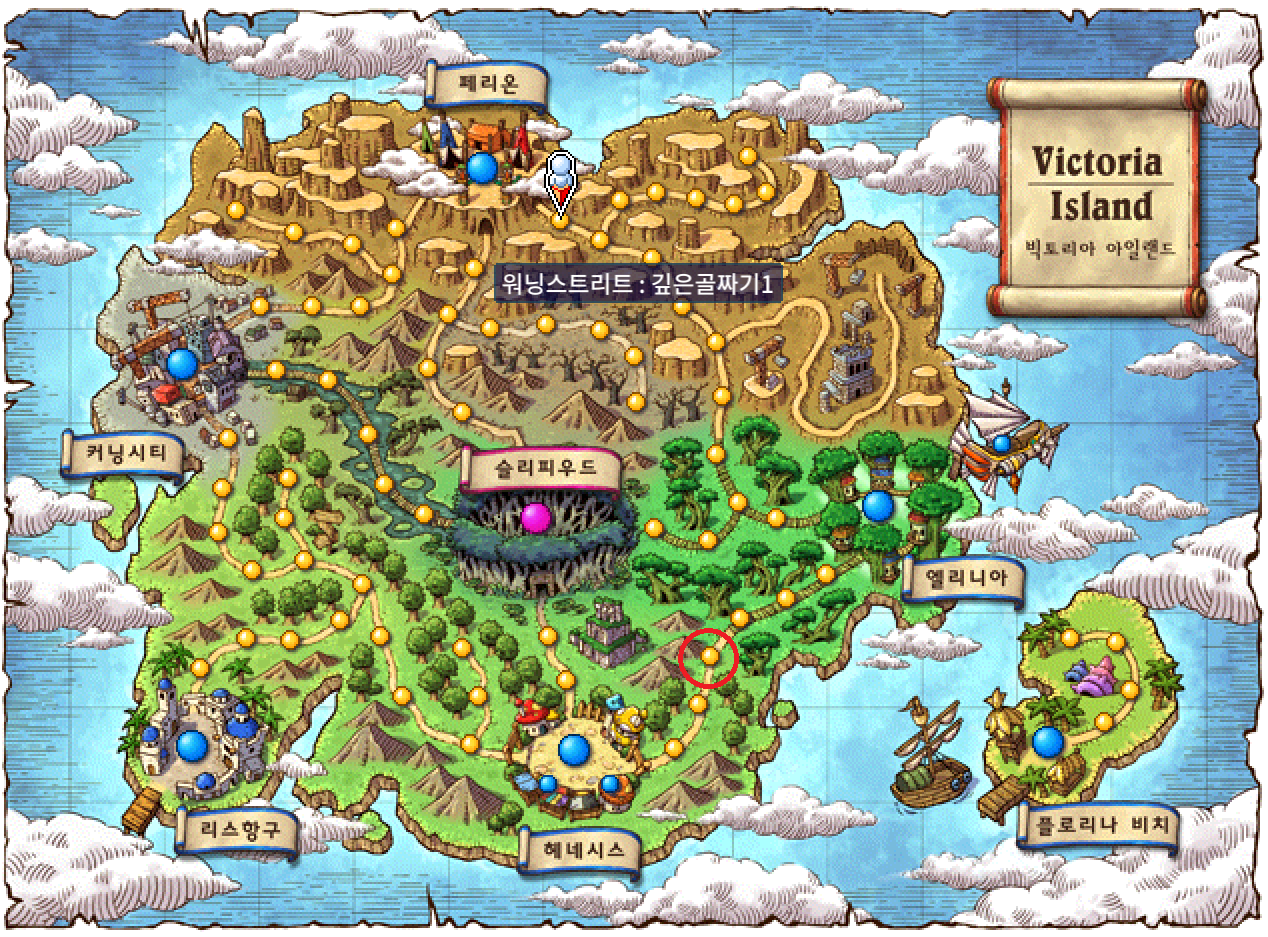 아래 맵은 "헤네시스 동쪽 숲"인데, 히든 포탈 위치는 위쪽에 보이는 이정표입니다.