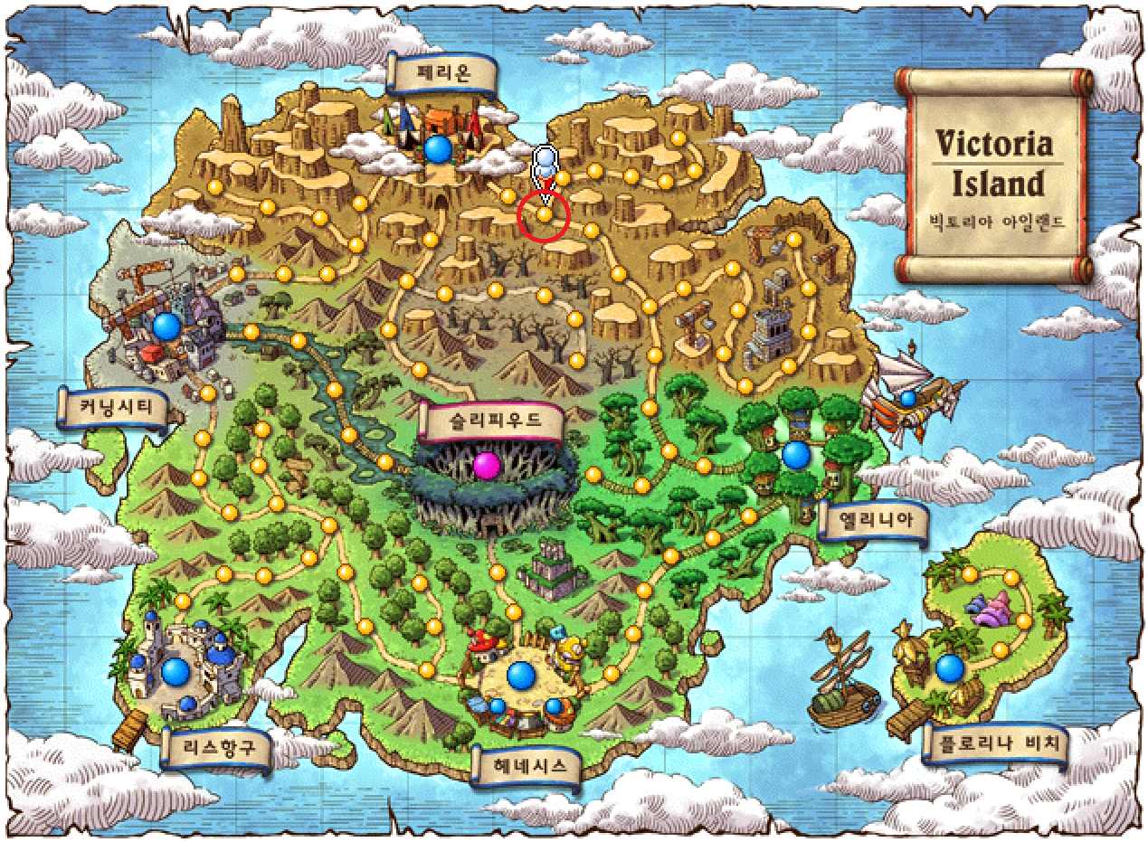 "동쪽바위산1"은 페리온에서 매우 가까워요, 아래에 빨간색 원으로 표시한 것처럼 두번 맵을 이동하시면 되거든요.